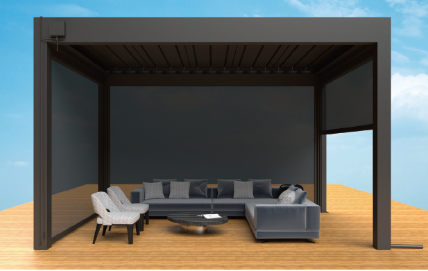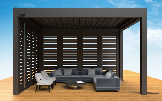 Da bo bivanje na prostem res možno v vseh vremenih in temperaturnih razlikah, poleg dodatkov in stranskih senčil poskrbijo predvsem glavne lamele, ki služijo kot kritina bioklimatske pergole DELUX. Odpirate in zapirate jih lahko glede na Vaše želje, počutje in vreme.