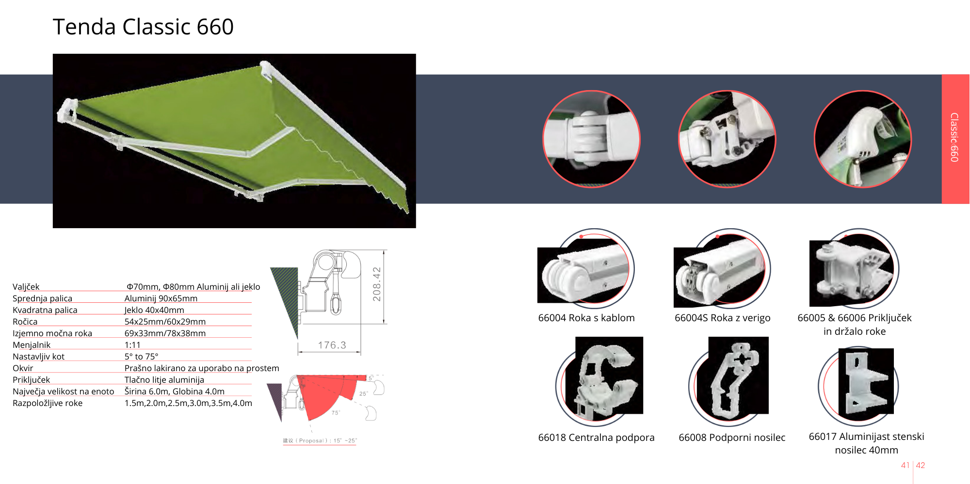 CLASSIC 660: Trpežna konstrukcija, kakovostna dvojna vzmetna napenjalna roka, robustna in vzdržljiva zložljiva roka, ter elegantna vgrajena aluminijasta sprednja palica za odvod dežja, ščiti pred kapljanjem dežja s konca zavese. Z le dvema rokama lahko pokrije velike površine do širine 6m in globine 4m. Izpolnjuje zahteve za velike površine senčenja. Podpira ročno in motorizirano upravljanje.