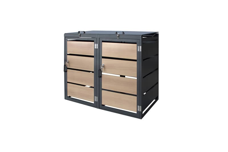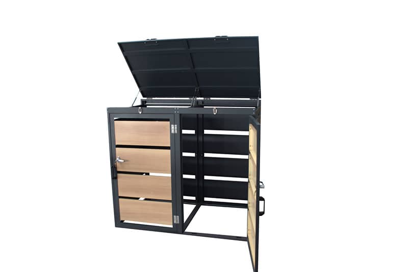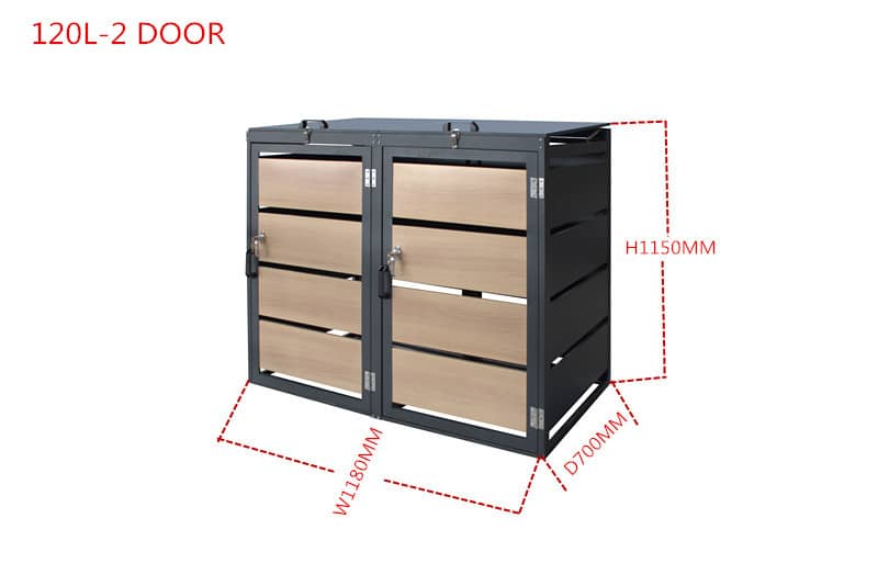 Ima dvoja posamično odpirajoča se vrata s sistemom zaklepanja na sprednji strani, tako da je zabojnike mogoče preprosto odstraniti in izprazniti. Smetarnik za shranjevanje zabojnikov za smeti je izdelan iz visokokakovostnega pocinkanega jekla, zaradi česar je zelo čvrst, trpežen, vodoodporen in odporen proti rjavenju. Ta "shramba" za smeti lahko sprejme 2 smetnjaka v velikosti 120L in se bo podala k vsakemu vrtnemu dekorju.